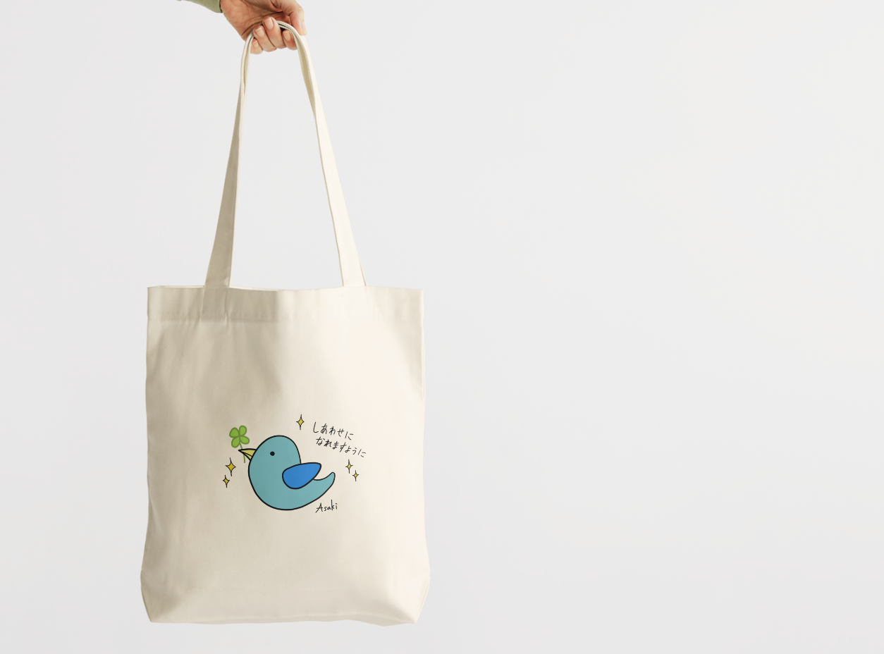 這是由本大屋原創企劃、北海道插畫家 Asaki 繪製的插圖帆布袋。主題靈感來自傳說中會帶來幸福的小鳥,插圖中的藍色小鳥懷抱著四葉幸運草,在空中自由飛翔,象徵幸運即將降臨,溫柔地點亮日常時光。