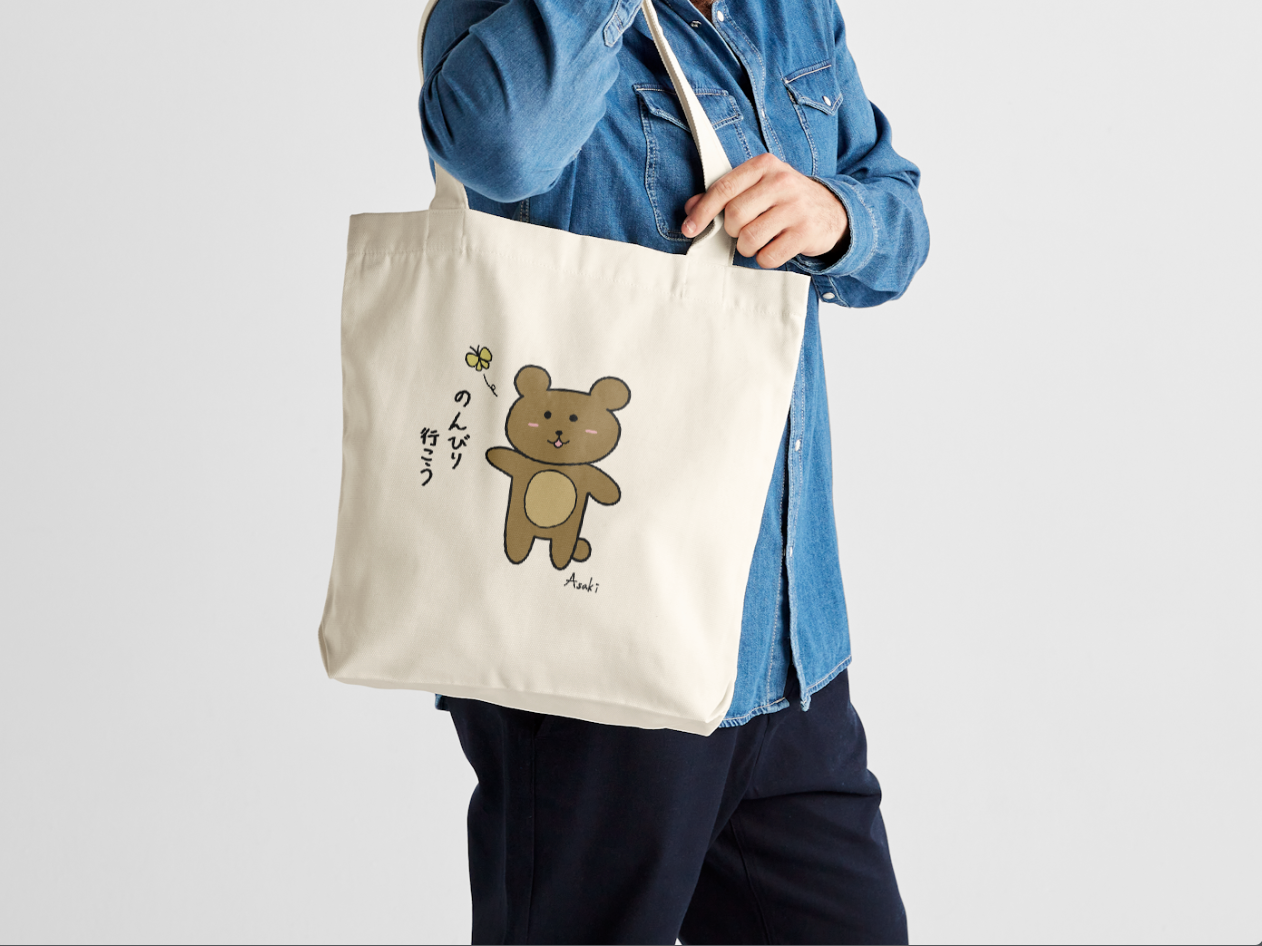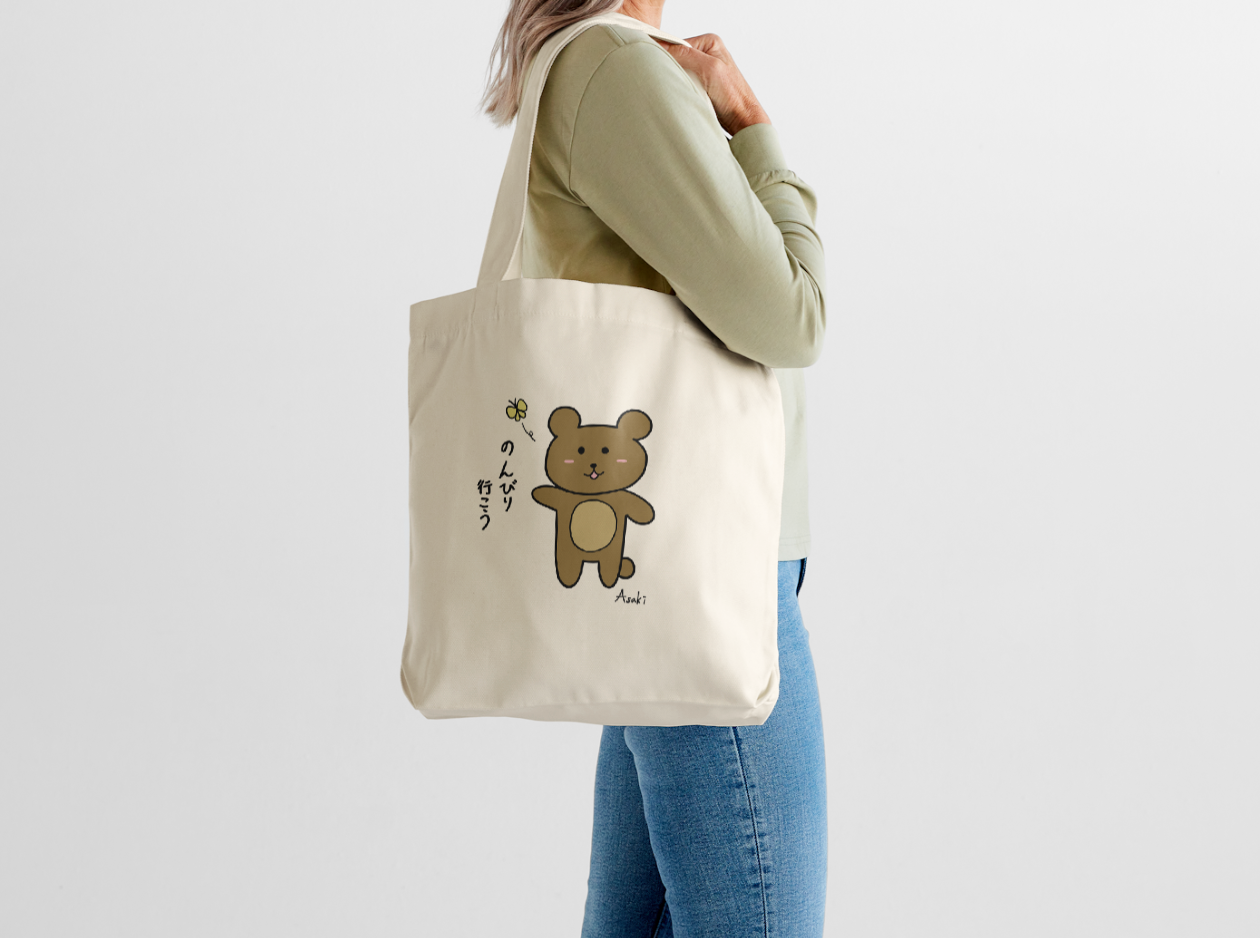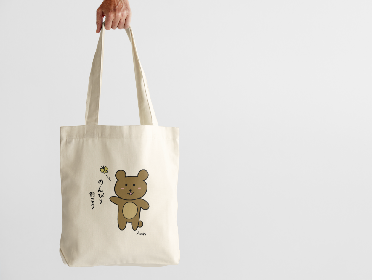 這是由本大屋原創企劃、北海道插畫家 Asaki 繪製的插圖帆布袋。主角是一隻悠哉散步的茶色くま(小熊),身旁有隻蝴蝶陪伴牠穿越午後的公園。圖案靈感來自日常的放空時刻與想逃離快節奏生活的心情。