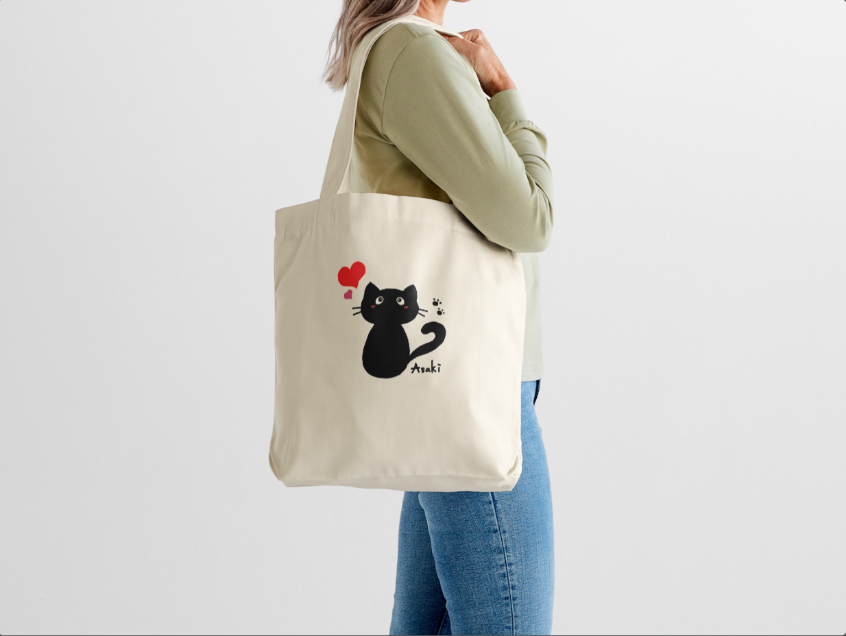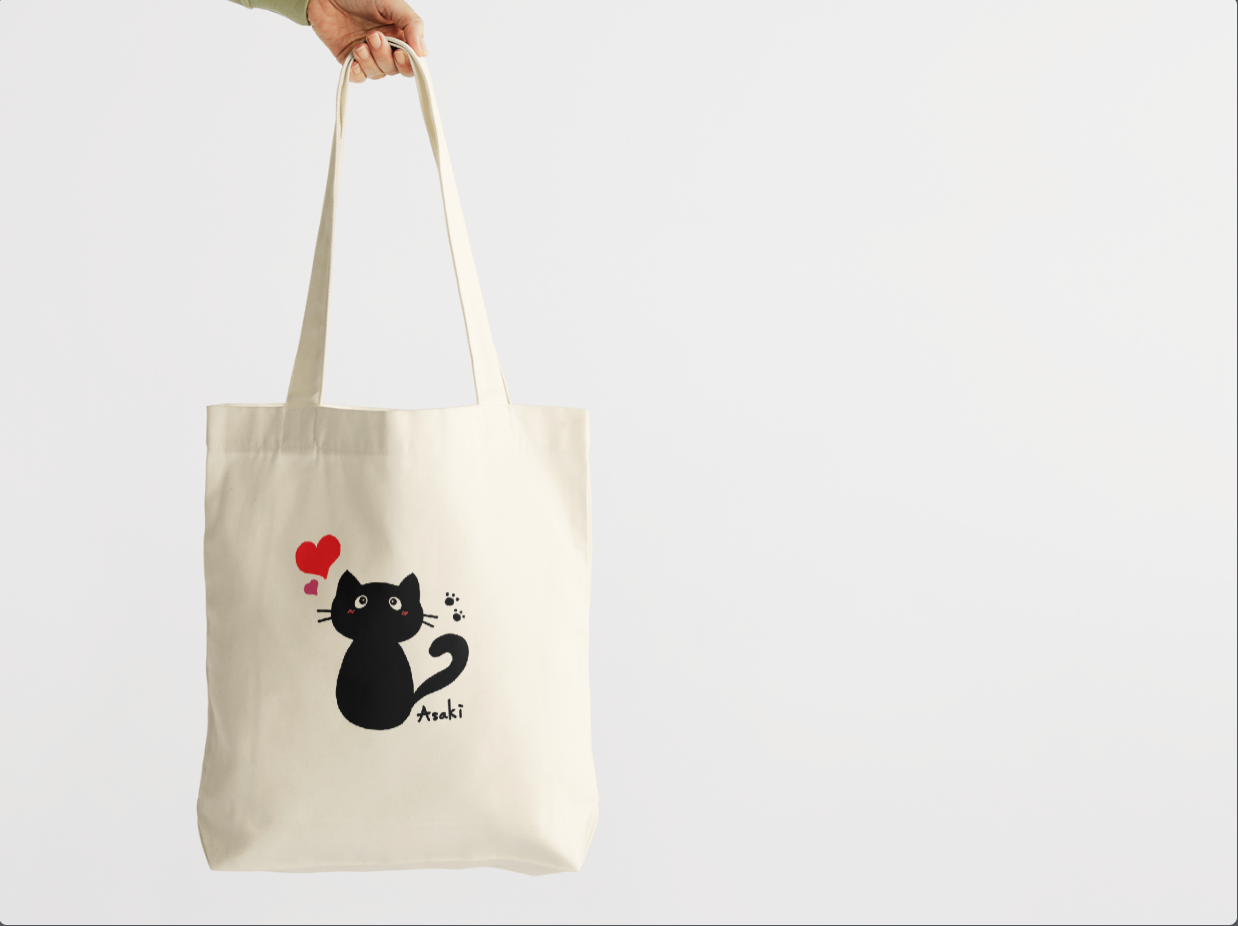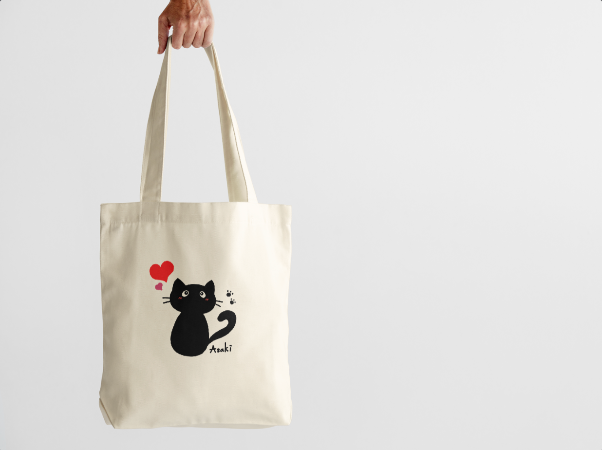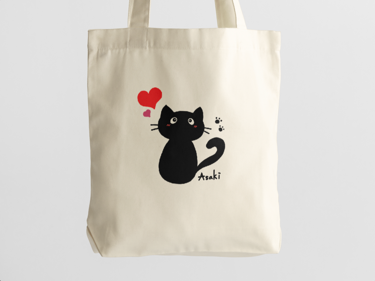 這是由本大屋原創企劃、北海道插畫家 Asaki 繪製的插圖帆布袋。主角是一隻神情可愛的黑貓,踏著輕盈的腳步、身旁飄著鮮紅的愛心。插畫以黑與紅的配色為主,充滿日系極簡氣息,也展現了貓咪溫柔又淘氣的氣質。