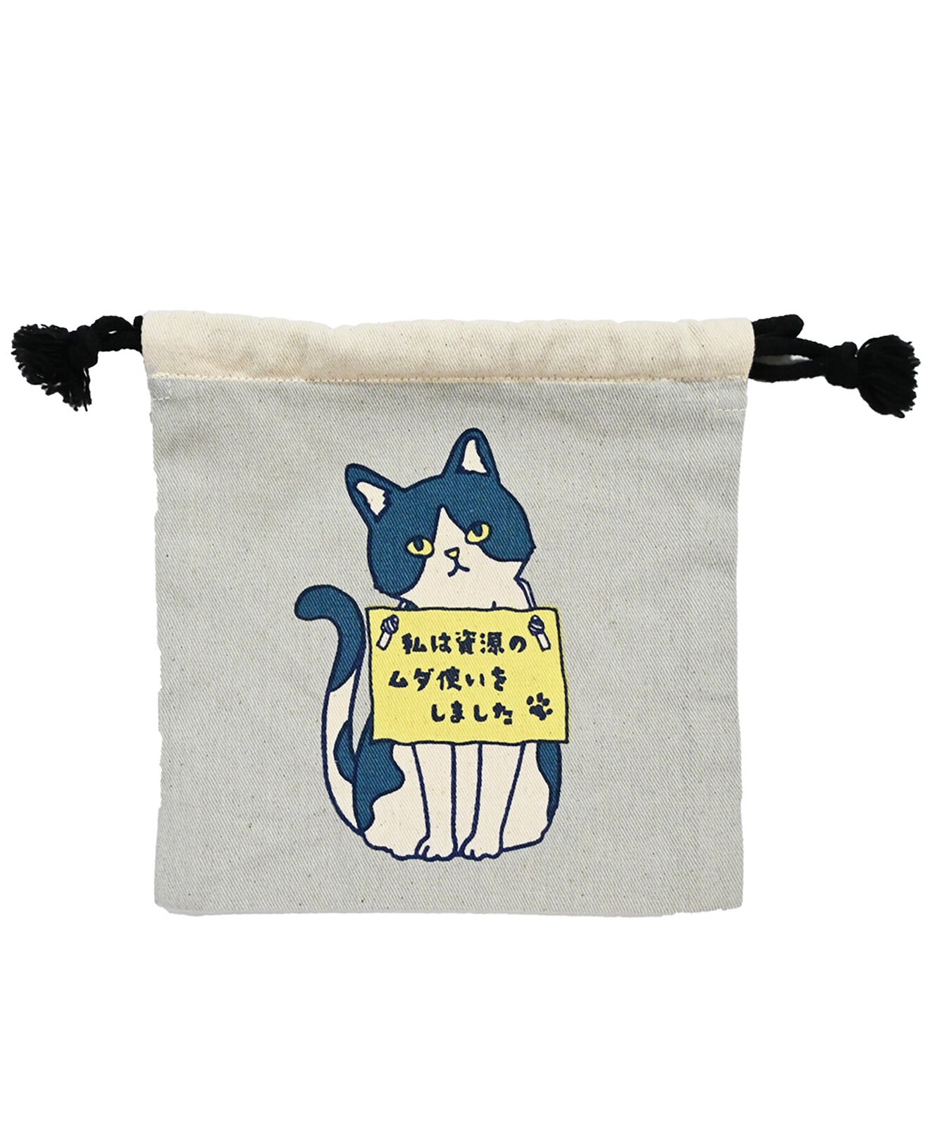 罪深貓束口收納袋|灰色八字花貓 × 搞怪表情設計|棉布小物袋