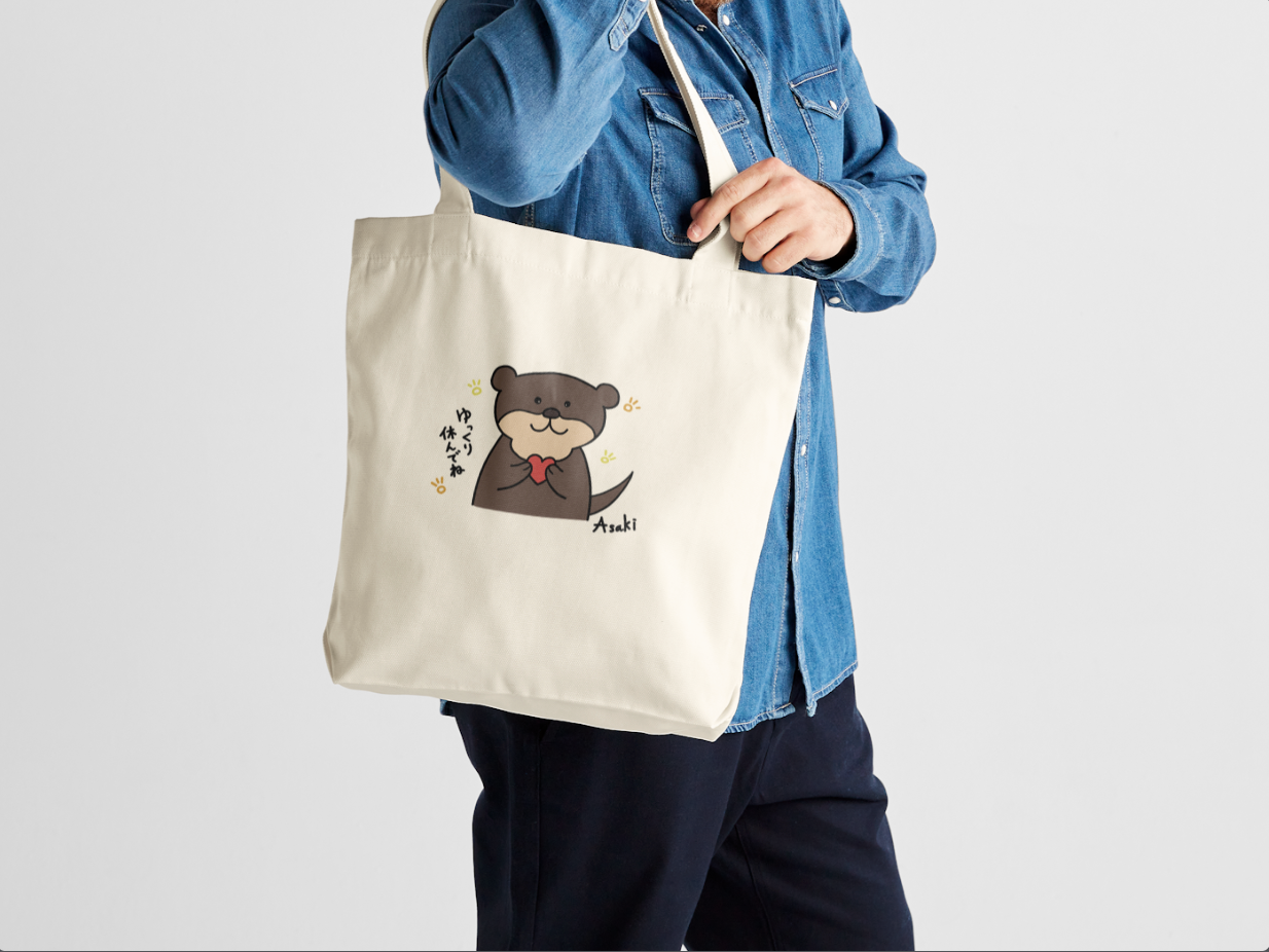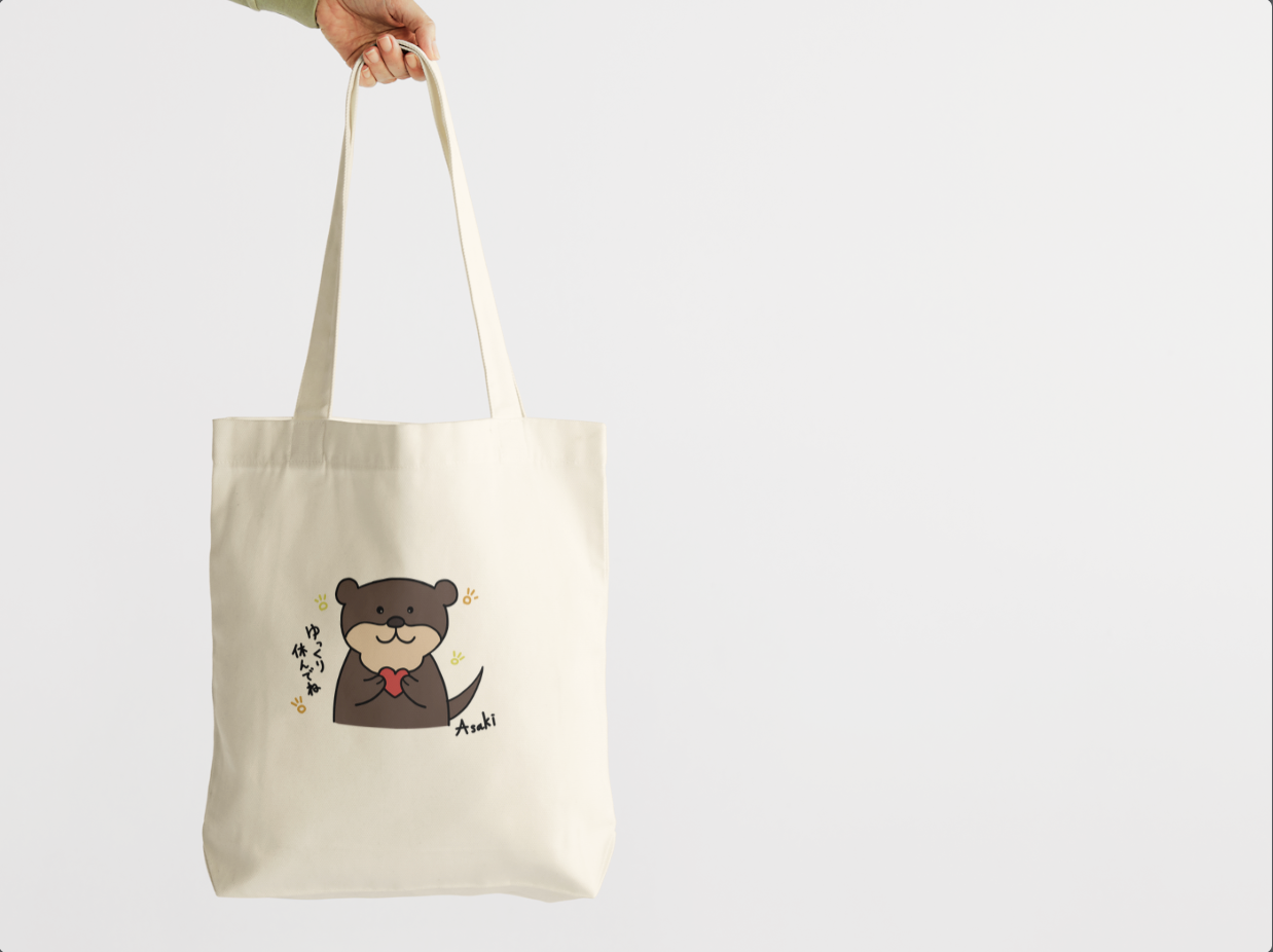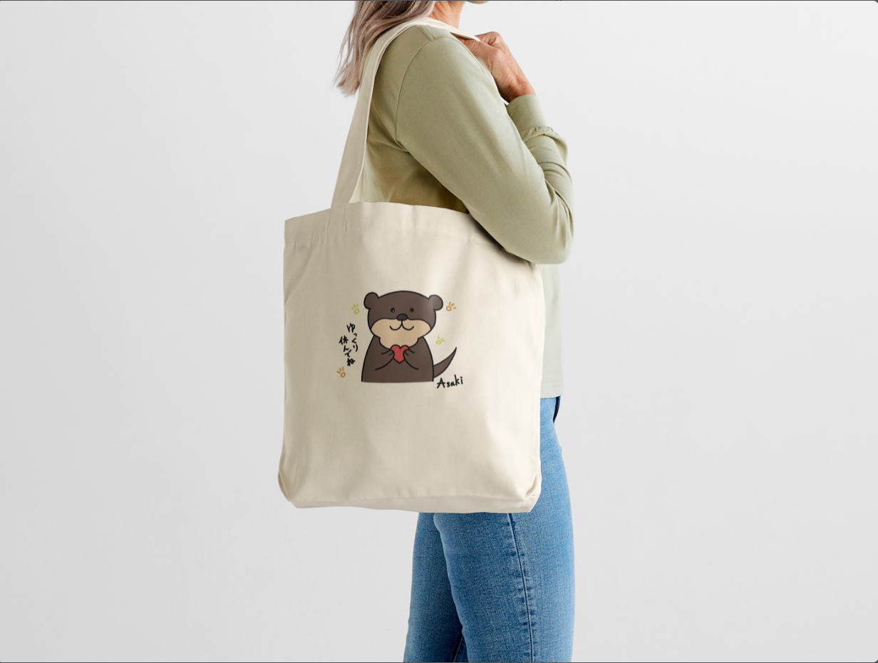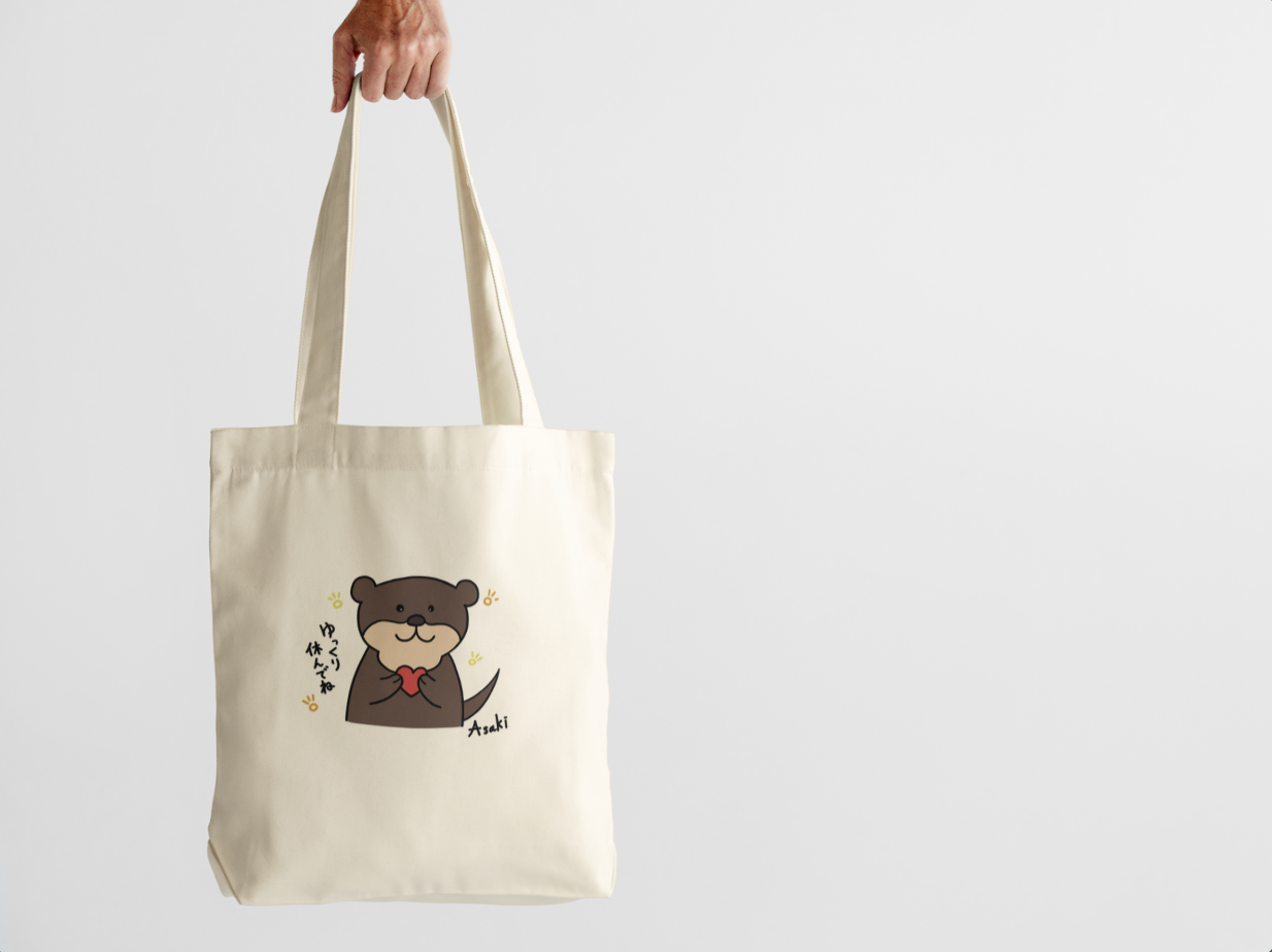 這是由本大屋原創企劃、北海道插畫家 Asaki 繪製的插圖帆布袋。主角是一隻可愛的水獺,靜靜地抱著愛心,好像在對你說:「今天辛苦了,好好休息吧。」插畫傳遞著柔和與溫暖,獻給那些總是努力過頭、卻忘了照顧自己的你。